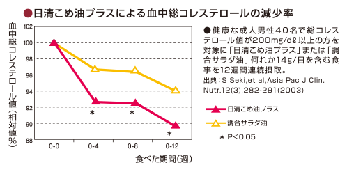 コレステロール値が高めの方に、通常の油(調合サラダ油)に替えてこめ油プラスを14g/日を含む食事を12週間(3ヶ月間)続けた結果、コレステロール値が減少しました。